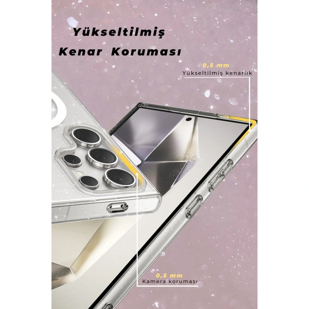 Glow MagSafe Kapak, telefonunuzu her açıdan öne çıkaran parlak ve şık bir tasarıma sahiptir. Simli arka planı, ışık altında parlayarak cihazınıza göz alıcı bir görünüm kazandırır.